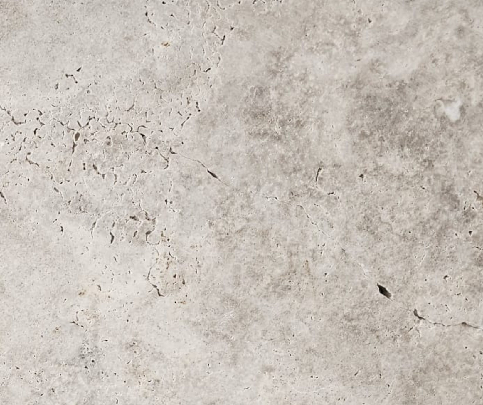 A striking travertine with a bright white-grey base cut through with bold, wandering veins in warm beige, taupe, and charcoal. The movement in this stone is dramatic — branching formations sweep across each paver like rivers seen from above, making it one of the more visually active travertines in the range.